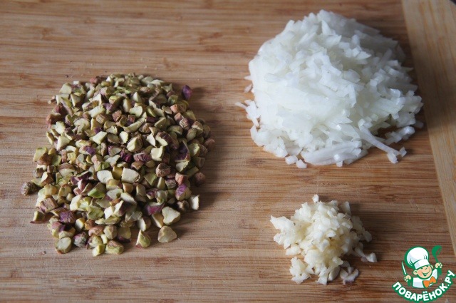 Лук измельчить, чеснок раздавить и порубить. Фисташки нарубить ножом на кусочки.