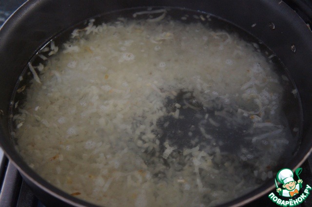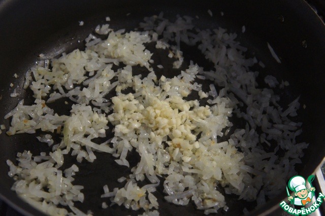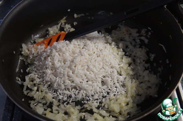 Затем всыпать промытый рис и слегка все обжарить. Рис должен стать почти прозрачным.