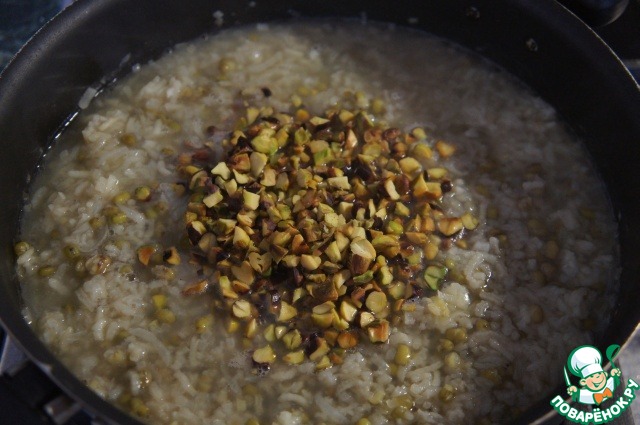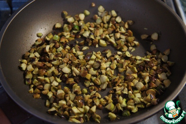 Фисташки слегка обжарить на слабом огне в небольшом количестве топленого (для вегетарианского) или растительного (для постного варианта) масла. Часть отложить для украшения.