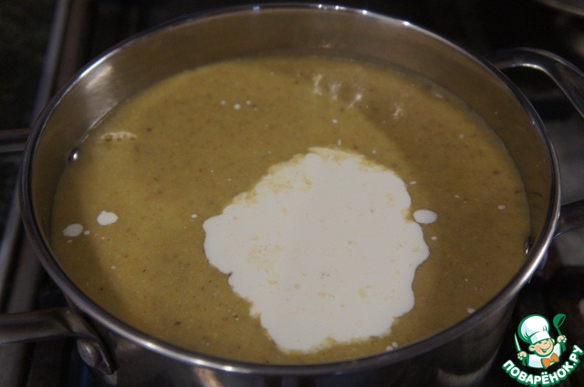 Для непостного варианта вернуть суп в кастрюлю, влить сливки и прогреть суп, не доводя до кипения.