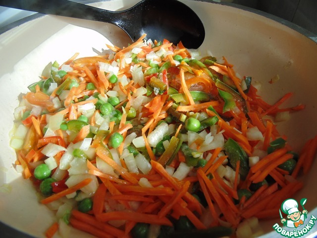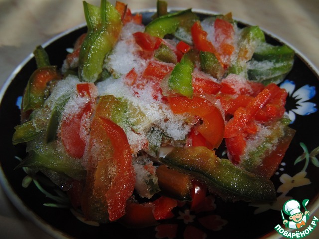 Болгарский перец нарезать соломкой (у меня был уже нарезанный и замороженный)