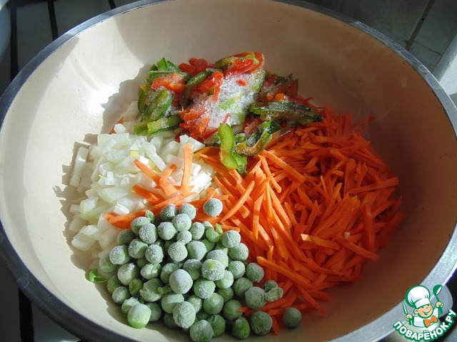 На сковороду налить растительное масло и выложить все овощи, поперчить.