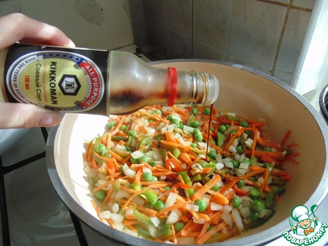 В сковороду с овощами влить натурально сваренный соевый соус Kikkoman. Соевого соуса должно быть много, чтобы все овощи хорошо пропитались. Всё перемешать.
