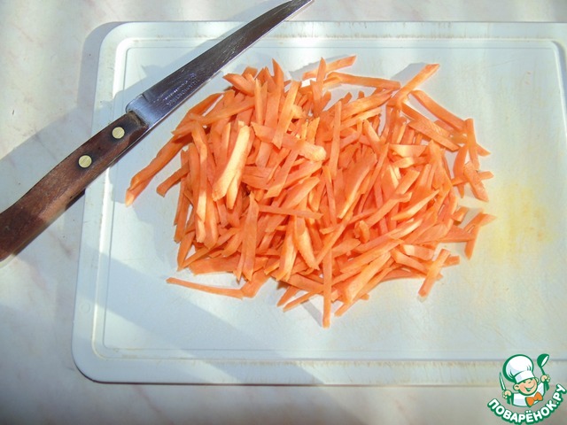Морковь среднего размера помыть, почистить и нарезать тонкой соломкой.