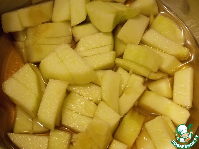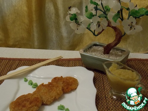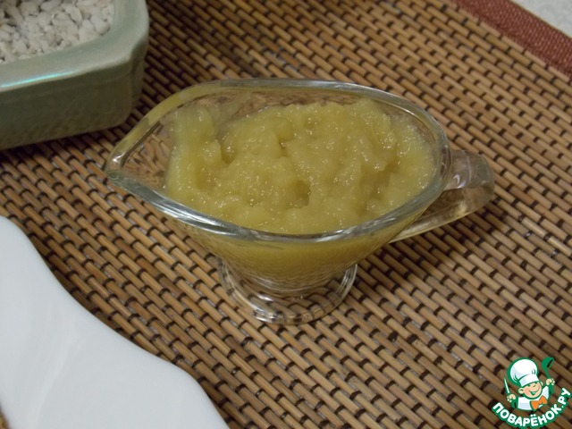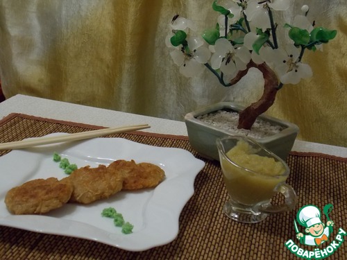 Сначала делаем соус. Яблоки помыть, почистить, нарезать на небольшие кубики. Добавить воды в уровень яблок. Добавить соевый соус и варить до мягкости яблок. Пюрировать и оставить остывать.
