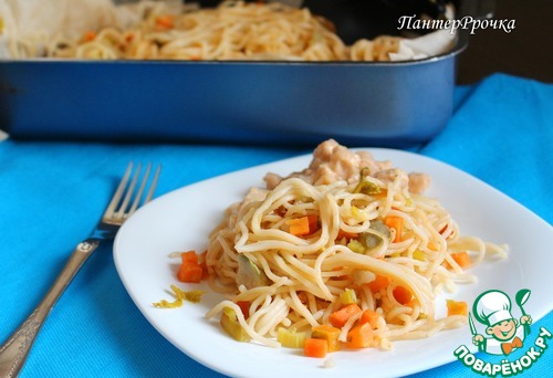 Подготовить 2 листа пергамента (размером больше формы), немного смазать их маслом. На один выложить спагетти с овощами, сверху накрыть вторым листом, края завернуть. Готовить в предварительно разогретой при 200 градусах духовке 15 минут.