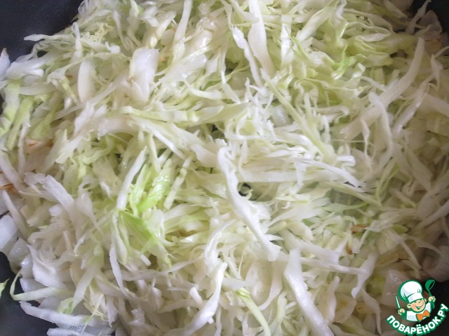 Капусту порезать крупной соломкой. На разогретую сковороду налить половину оливкового масла и обжарить лук до золотистого цвета. Добавить капусту и жарить до полуготовности.
