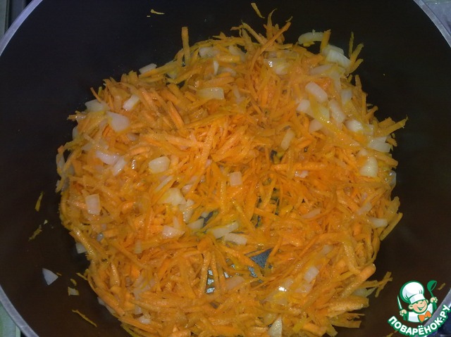 В глубоком сотейнике обжарить оставшийся лук порезанный кубиками. Добавить крупно натёртую морковь и обжарить 5-7 минут.