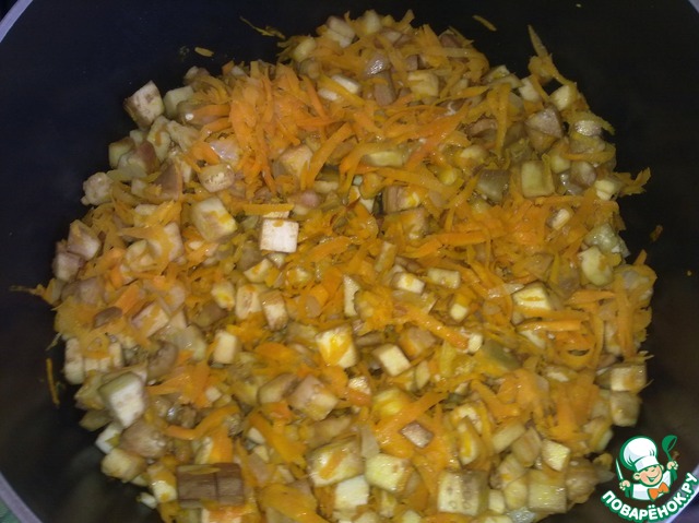 Добавить кубиками нарезанные баклажаны, жарить ещё минут 10.