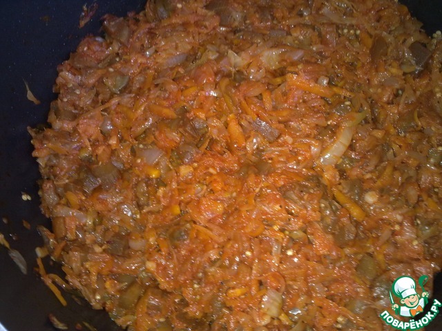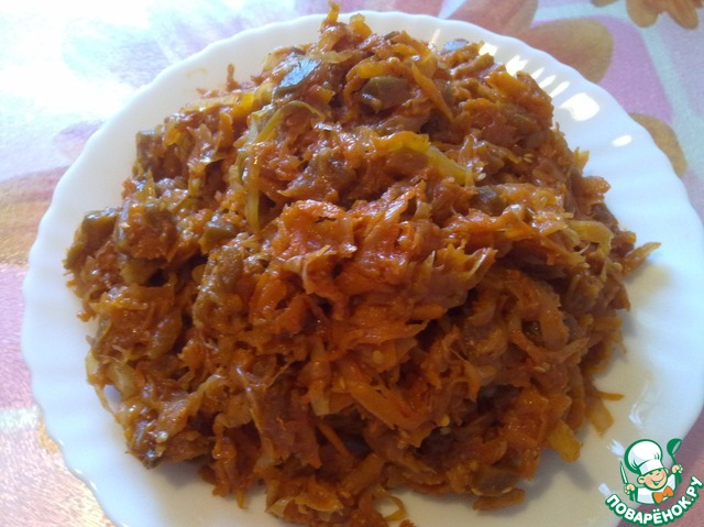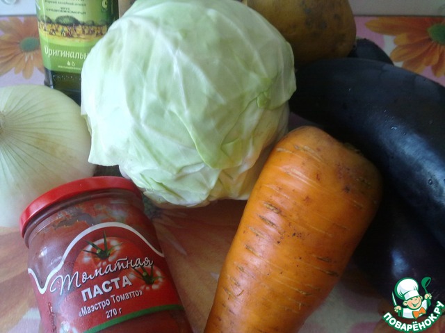 Теперь нужно соединить обжаренную капусту с баклажанами, посолить по вкусу, добавить томатную пасту, немного разведённую водой и специи по вкусу. Тушить под крышкой ещё 15-20 минут.