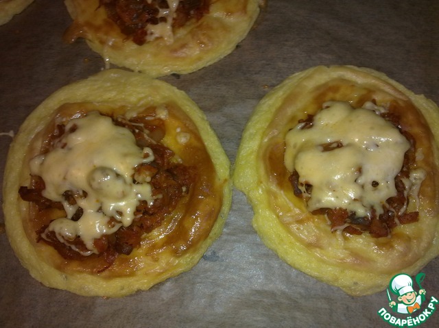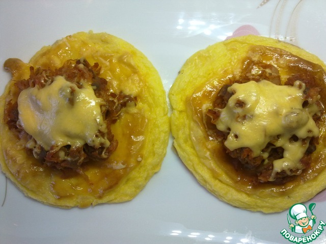 Сверху на готовые лепёшки выкладываем начинку и посыпаем натёртым сыром. Снова ставим в духовку на 10 минут.