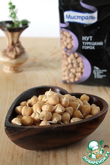 Проростки нута отварить в подсоленной воде до мягкости, примерно 15 минут. Проращиванием нута нужно озаботиться примерно за 1,5 дня до приготовления блюда. Расскажу, как это делаю я. Нут промываю и заливаю водой, оставляю на ночь. Утром снова промываю, выкладываю в неглубокую тарелку и наливаю немного воды на дно (2-3 мм). Сверху накрываю тарелку смоченным в воде бумажным полотенцем, ставлю в такое место, куда не попадают прямые солнечные лучи. Скорее всего уже к вечеру у нута появятся маленькие проростки. Считается, что наиболее полезными свойствами обладают зёрна с небольшими проростками 2-3 мм. Но для наглядности я их прорастила чуть побольше. Усвоение всех полезных веществ, содержащихся в проростках, происходит намного легче и быстрее, потому что эти вещества уже находятся в расщеплённом состоянии. Пророщенный нут содержит большое количество витамина С, укрепляет иммунитет и служит отличной профилактикой простудных заболеваний, что, согласитесь, весной очень кстати. А ещё способствует потере лишнего веса)
