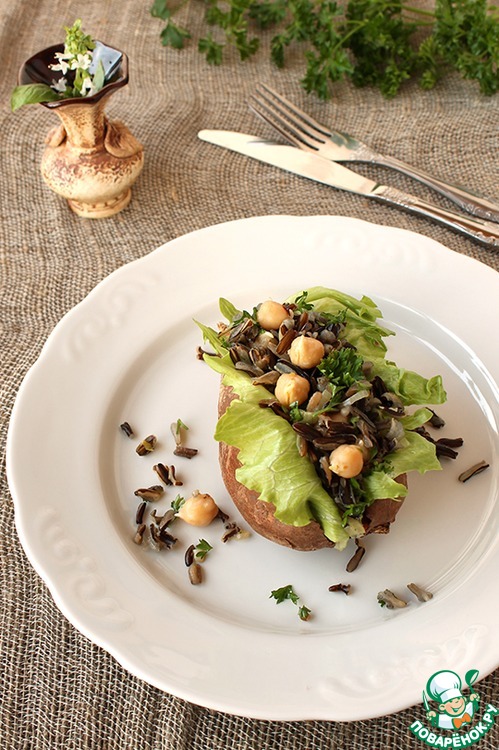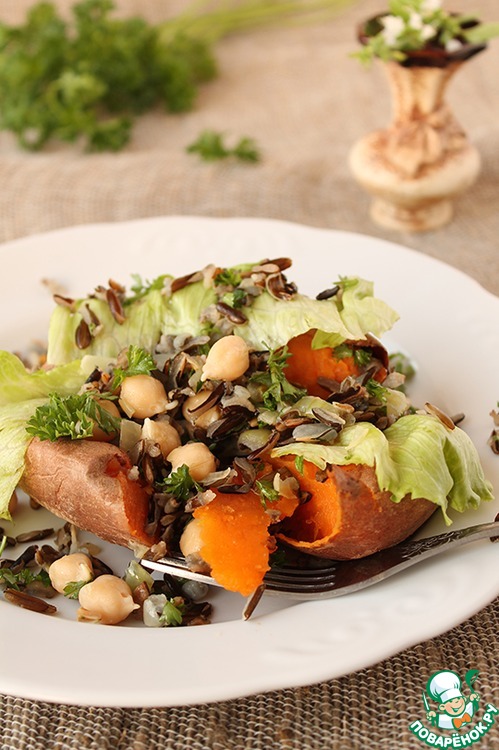 Смешать вместе готовый рис с проростками нута, добавить лук, петрушку, соль по вкусу. Батат разрезать вдоль не до конца, вложить лист салата и сверху выложить начинку. И сразу же подавать, приятного аппетита!