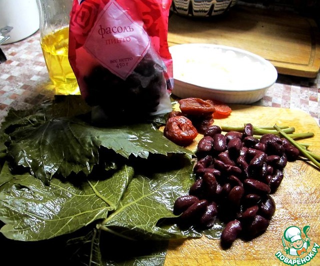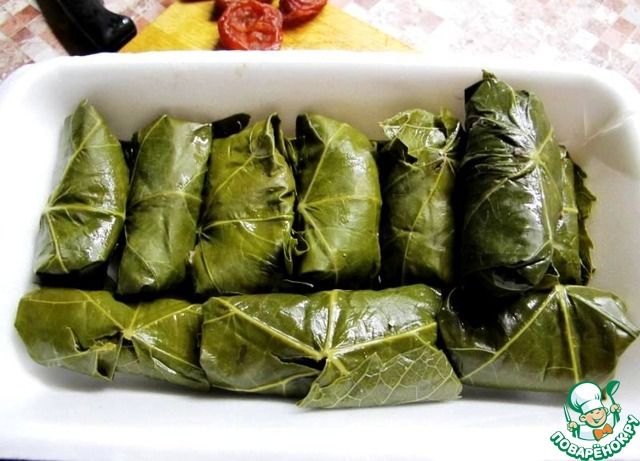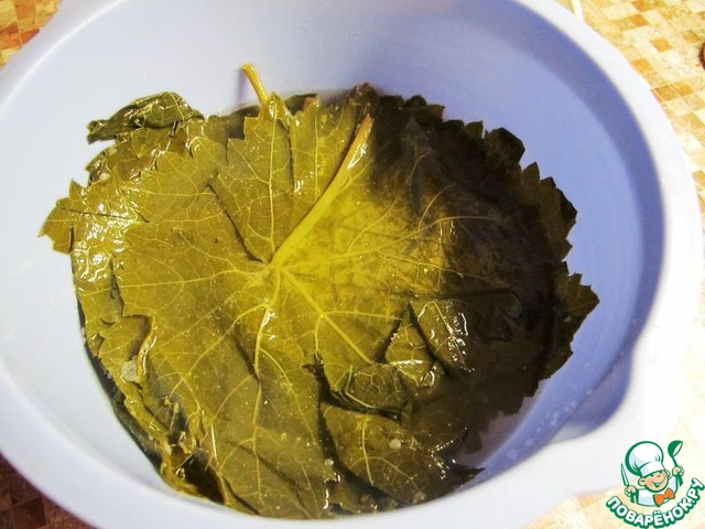 Виноградные листья вымочить в воде и промыть. Удалить ножки листьев.