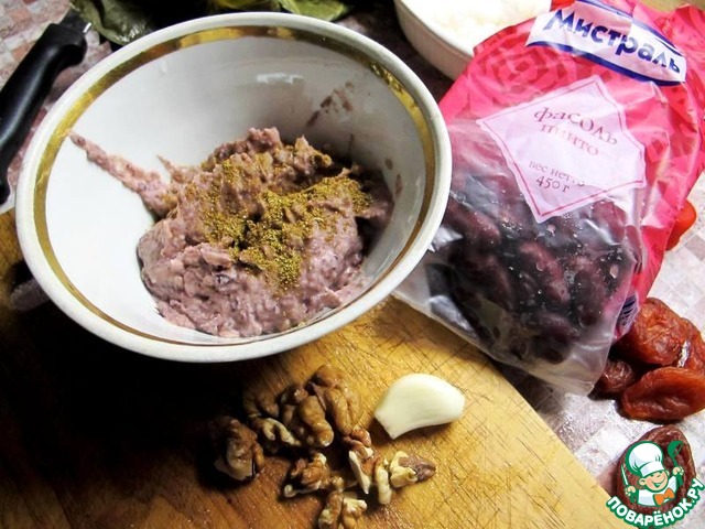 Пропустить в блендере фасоль. В пюре добавить растолченный грецкий орех, и мелко натертый чеснок. Смешать с нарубленной зеленью, рисом и хмели-су-нели.
