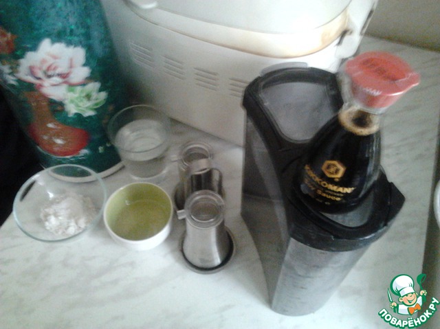 Для начала необходимо сделать тесто. Я делала тесто в хлебопечке в режиме "дрожжевое тесто" из перечисленных ингредиентов /дрожжи, вода, отруби, соль, растительное масло, соевый соус KIKKOMAN/.