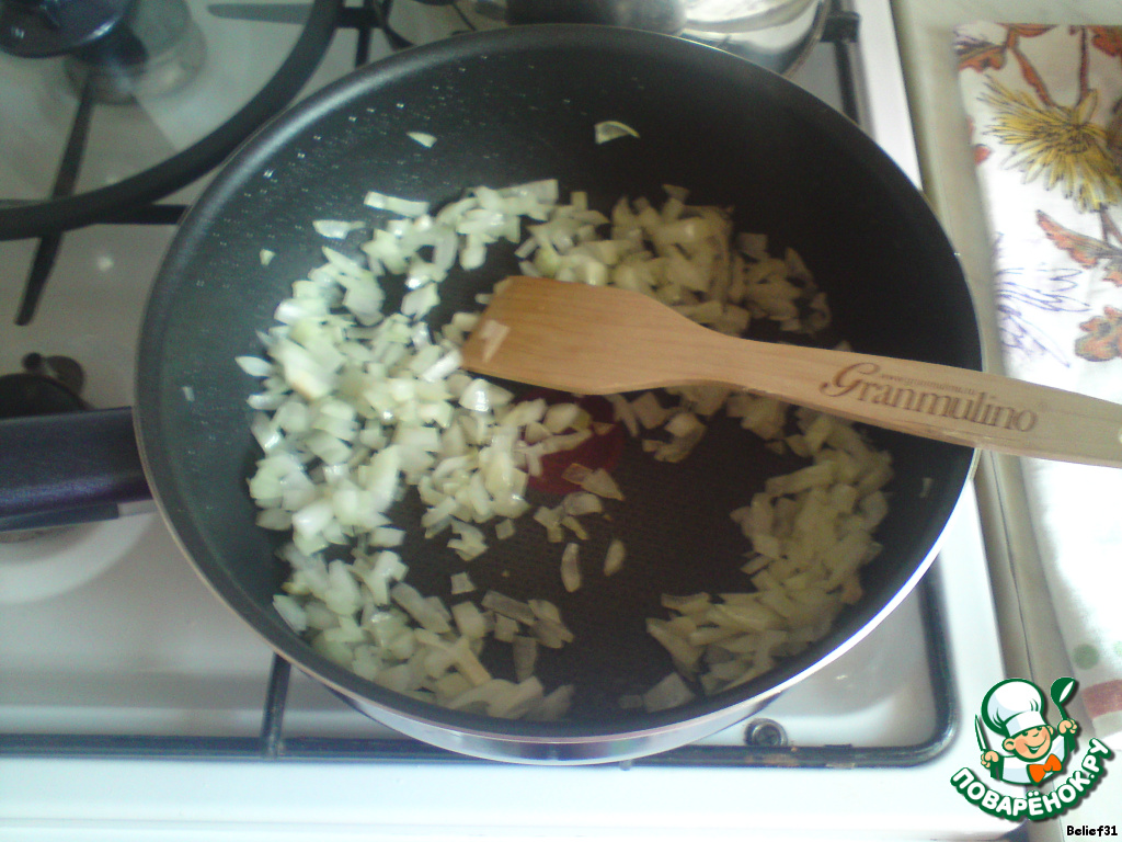 Мелко режем лук и слегка обжариваем.