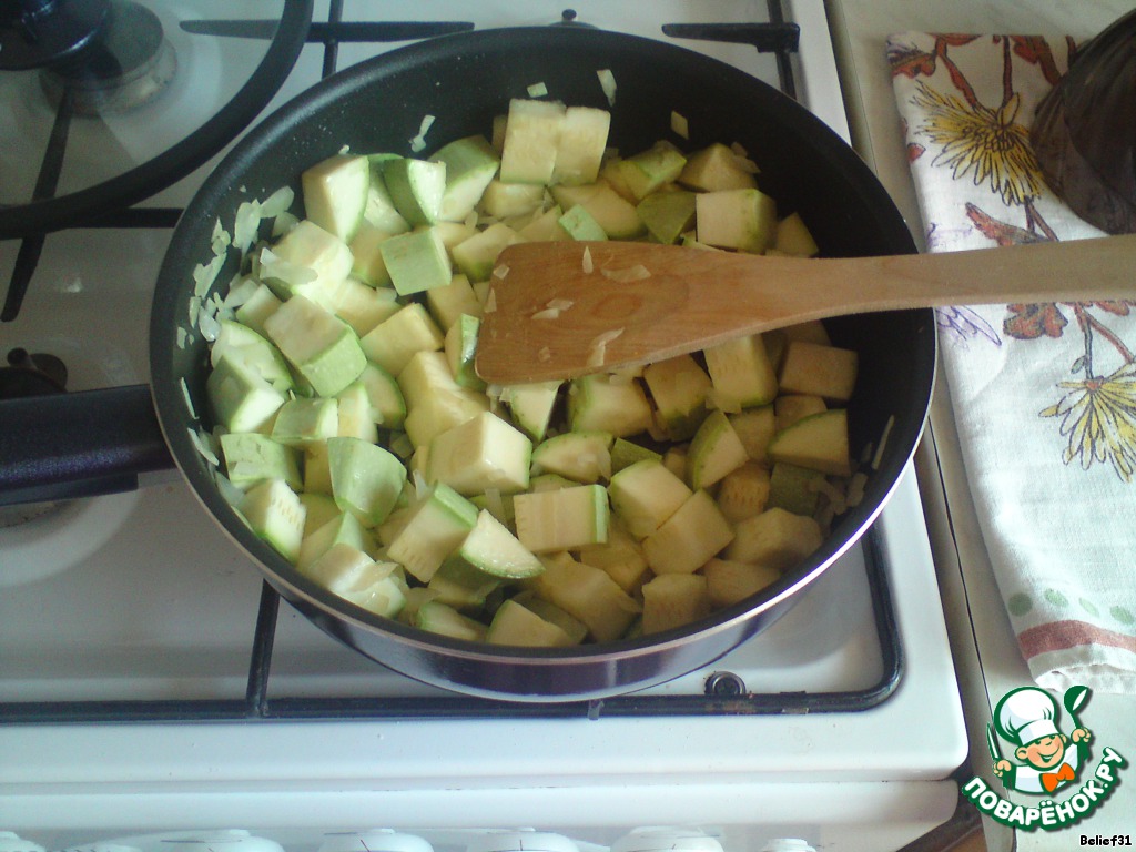 Кабачки чистим, если требуется (у меня молодые, я не чистила) и режем кубиками, отправляем к луку. Жарим, помешивая, 3 минуты.