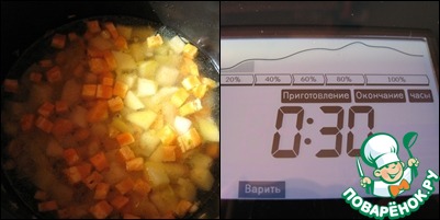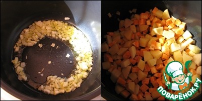 Разогреть в чаше 2 ст. л. растительного масла. Спассеровать лук, затем добавить нарезанные кубиками картофель и морковь и немного их обжарить.