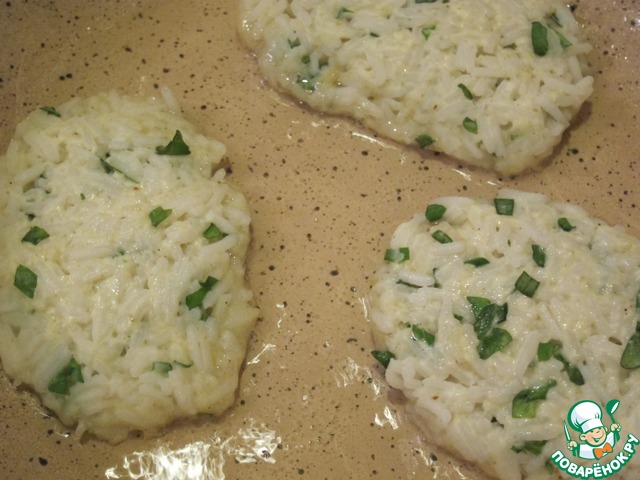 Рис отварить в подсоленной воде 15 минут, даже можно на пару минут дольше, тогда рис немного разварится и лепешки будут легче лепиться.