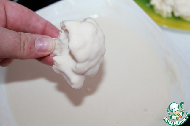 Делаем кляр. Для этого смешиваем муку с 2 ст. л. крахмала и добавляем воду. Разбиваем комочки. Кляр должен получиться как густая сметана, при необходимости добавляем муку. В кляре обваливаем каждое соцветие и отправляем на сковороду с разогретым растительным маслом.