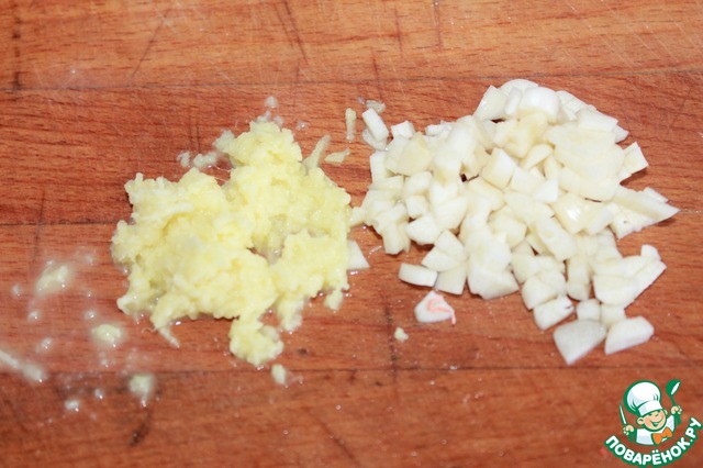 Мелко нарезаем чеснок, трем имбирь.