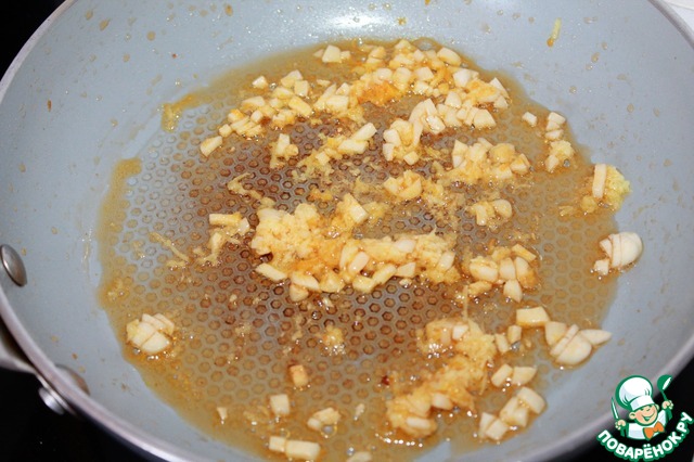 На сковороде где жарился перец обжариваем чеснок и имбирь.