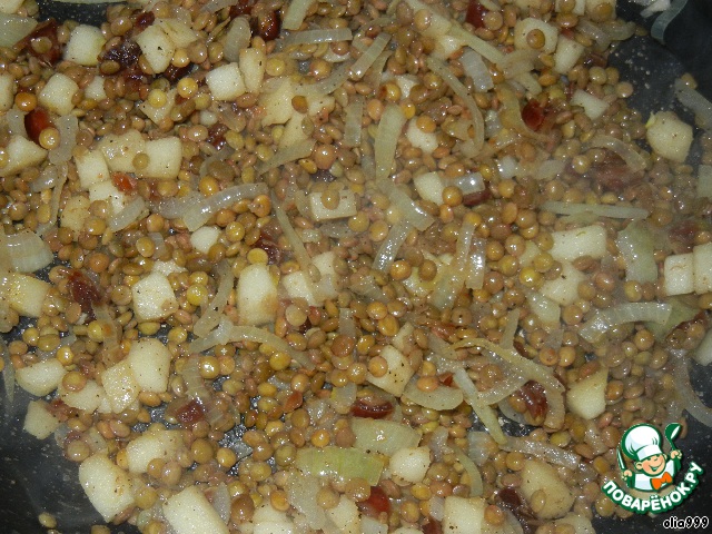 На сковороде растопим сливочное масло, выкладываем лук, нарезанный полукольцами, и истолченный чеснок. Тушим 3-5 минут, затем добавляем порезанные кубиками яблоко и финики. Выкладываем чечевицу, приправляем молотым кориандром, солью, перцем и готовим 10 минут.