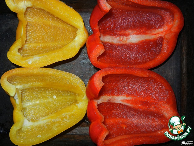 Выкладываем перцы в противень (форму), смазанный маслом, и накрываем его фольгой. Запекаем 25-30 минут при температуре 190 градусов, перцы должны стать мягкими.