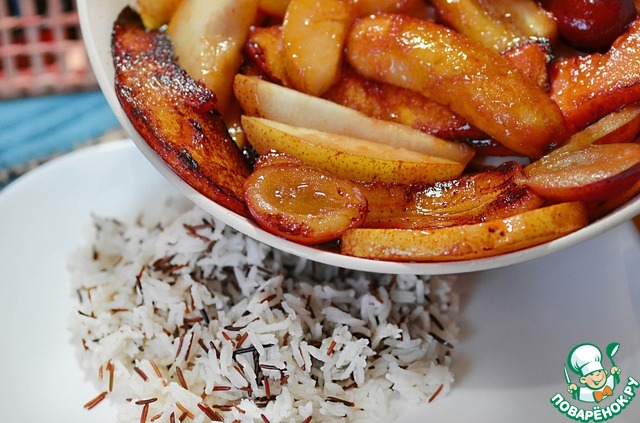 Сверху выложить тыкву и фрукты в сиропе. Перемешать, аккуратно поднимая рис с тарелки, стараясь не поломать форму карамелизированных фруктов.