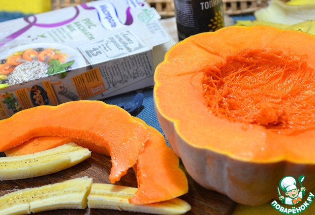 Тыкву нарезать крупными, но тонкими кусками. Такая нарезка лучше всего для идеального впитывания сиропа с маслом. Рис Басмати Микс положить в кипящую подсоленную воду. Закрыть крышкой. Рис от Мистраль варится 15 минут. Банан нарезать по всей длине на крупные куски.