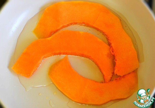 Тыкву обжарить в растительном масле с двух сторoн, по 2 минуты на каждой.