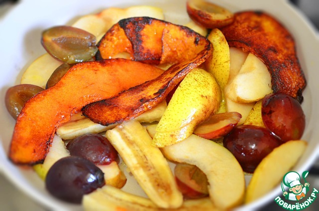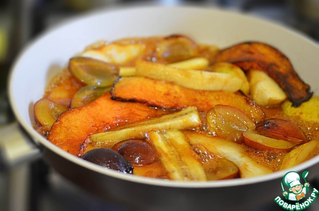 Когда тыква обжарится добавить к ней фрукты: банан, нарезанную на крупные куски грушу и сливы.