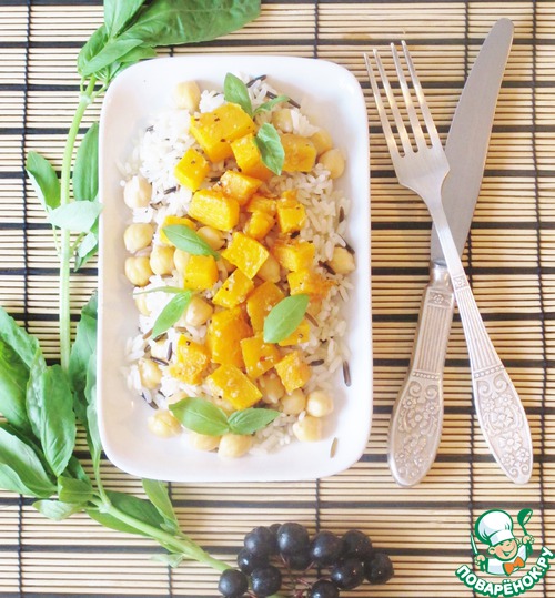 Рис выложить на тарелку, сверху положить кубики тыквы.