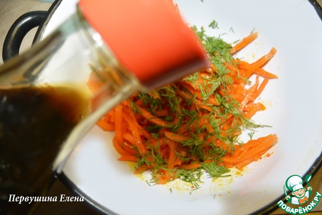К морковке добавить зелень, измельченный чеснок, перец и соевый соус. Перемешать.