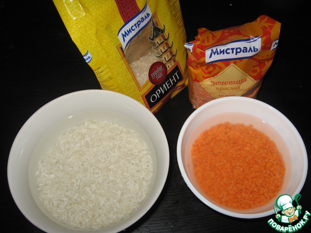 Рис и чечевицу промываем и замачиваем на ночь в холодной воде.
