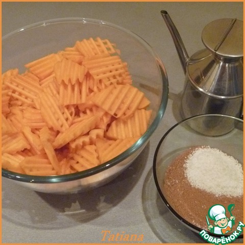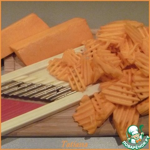 Нарежьте тыквенные брусочки поперёк пластинами по 0,5 см. (можно фигурной резкой)