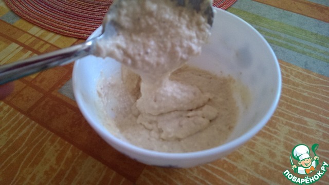 Всыпать оба вида муки. Смешать. Тесто получается густое.