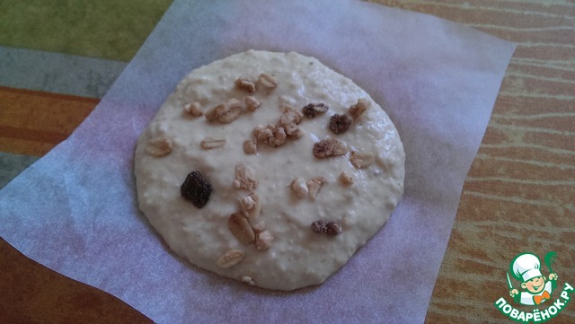 Ложкой выложить тесто на пекарскую бумагу. Сверху можно присыпать кунжутом, кокосовой стружкой или мюсли (как сделала я). Отправить наши будующие лепешки в дуковку до золотистого цвета. Время, к сожалению, не подскажу, ориентируйтесь на свою духовку.