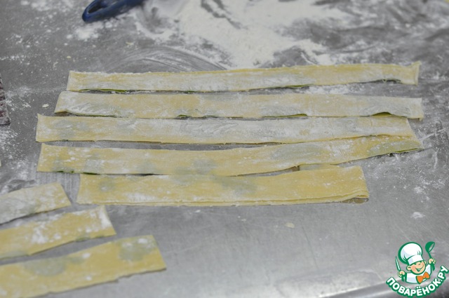 Замешиваем тесто на пасту, раскатывает на машинке для пасты, смазываем половину пласта водой, дальше раскладываем в хаотичном порядке базилик и петрушку, накрываем второй частью и немного раскатываем слегка. Разрезаем на небольшие листы, сворачиваем вдоль в рулет не плотно только и разрезаем на широкие пластины называемые папарделле.