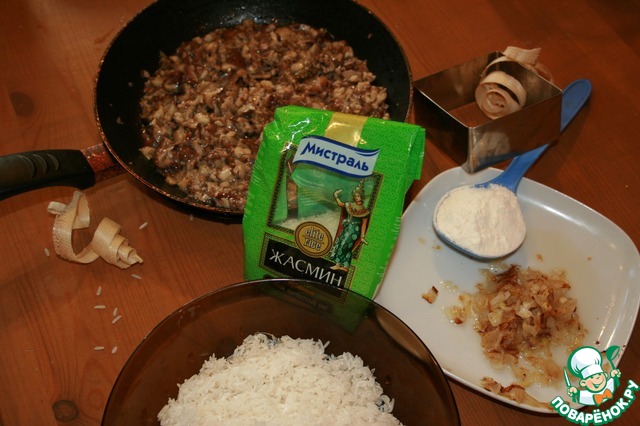 Исходная продуктовая корзина. Я уже обжарила лучок, припустила грибочки, промыла рис