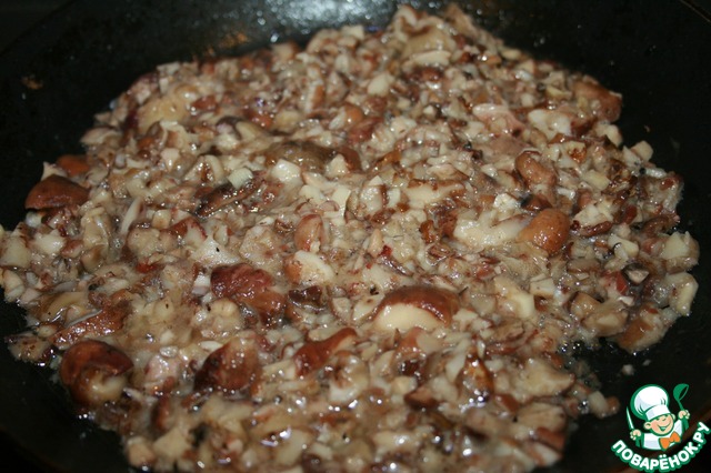 В это время, благо, что не нужно следить за крупой, мелко режем свежие грибы или же как я перемалываем замороженные. Обжариваем их на раст. масле, добавляем лучок. В конце готовности следует загустить нашу заправку - аккуратно вводим и размешиваем ложку муки. Какой же аромат дают маслята! Царь гриб!