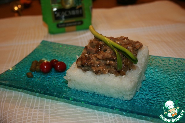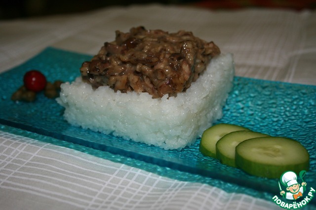 Вот прозвенел звоночек, рассыпчатый рис не требует промывания, просто красиво сервируем рис с грибами.