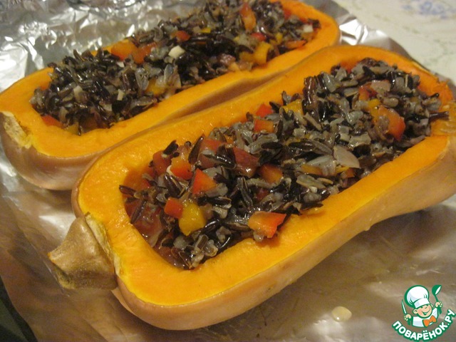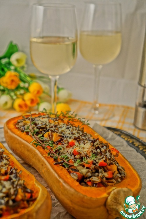 Изучая информацию о диком рисе, я прочла, что его можно подавать как самостоятельное блюдо -настолько он питателен и вкусен. Я решила, что можно пофантазировать с подачей - запечь дикий рис в тыкве. К рису добавила немного овощей и пряностей и блюдо получилось ярким и необычным.