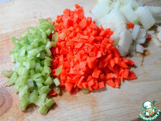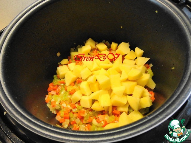 Включаем режим Жарка 140 градусов, вливаем три ложки растительного масла. Сначала обжариваем лук и морковь, потом добавляем сельдерей и чеснок. Готовим все примерно 15 минут.