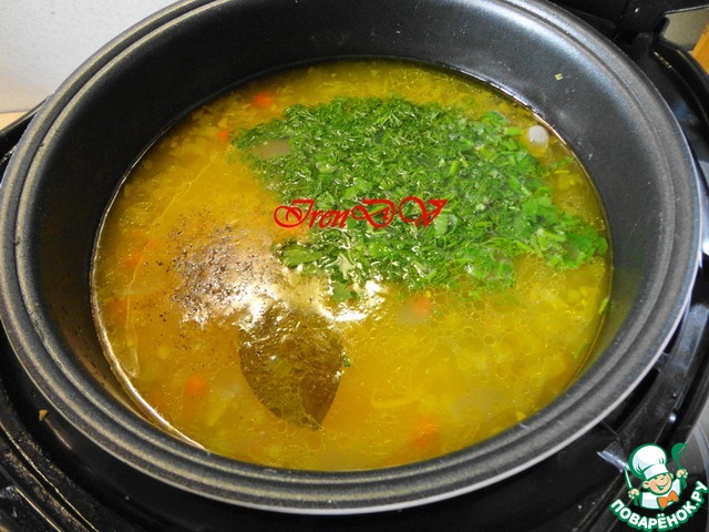 Затем переводим мультиварку на режим Суп. За 10 минут до окончания режима кладем лавровый лист, специи и зелень. Корректируем соль. Даем супчику настояться примерно полчаса.