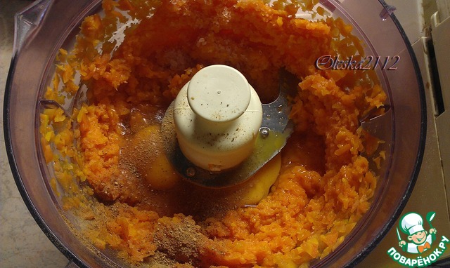 Отварную морковь измельчаем кухонным процессором, блендером или вилкой. У меня трудился "старичок процессор" :-) К измельчённой моркови добавляем яйца, молоко, мускатный орех, соль и всё тщательно перемешиваем.