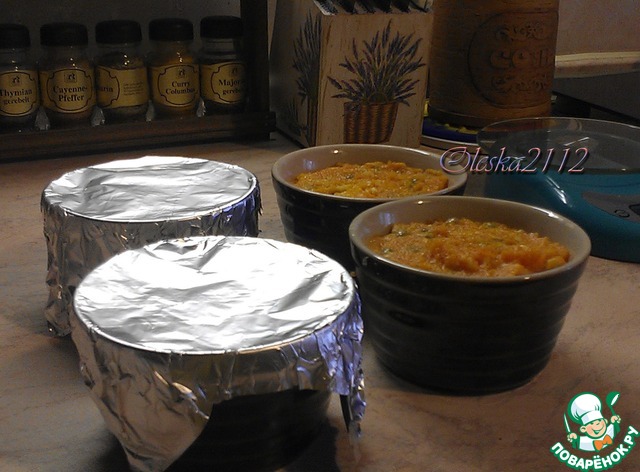 Теперь берём фольгу, разрываем её на кусочки и накрываем формочки с суфле сверху. Ставим в разогретую до 180*С духовку на 30 минут.