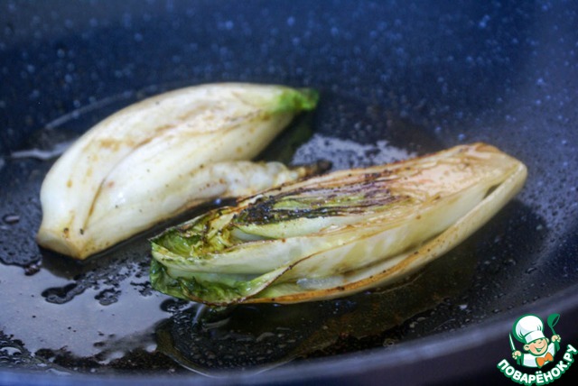 Сильно разогреть сковороду с толстым дном с ложкой растительного масла, выложить цикорий срезом вниз и поджарить около минуты до заметного зарумянивания, перевернуть и поджарить с другой стороны еще около минуты.