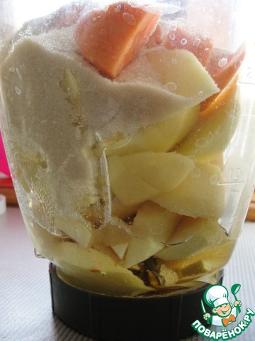 Наливаем в блендер полсакана растительного масла, чистим и режем яблоки, отправляем туда же, следом идет тем же путем морковь, кожура четверти апельсина и высыпаем стакан коричневого сахара ТМ "Мистраль". Все перемалываем, затем добавляем 1 стакан риса и перемалываем еще чуть-чуть.